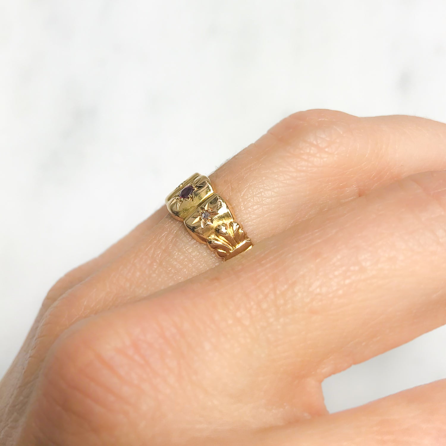 When we first tried this gypsy set ring on, we knew it was destined for The Vintage Ring Company. The scalloped 18 carat gold setting is so pretty it adds a whole new dimension to this classic ring design from the Edwardian era. Hallmarked Chester 1907, the original centre stone was a synthetic ruby, so we decided to replace it with a vibrant, 2.5mm ruby. Peggy holds much symbolism. Accompanied by two diamonds, the star setting that surrounds each of the gems is representative of a guiding light, while the fleur-de-lis emblem engraved on both sides of the ring signifies life, light and perfection. If you are looking for an alternative to a traditional engagement ring, gypsy set rings make a boldly feminine statement. Incredibly comfortable to wear, they are especially well suited to active women looking for a smoother ring that won’t catch on their clothes.