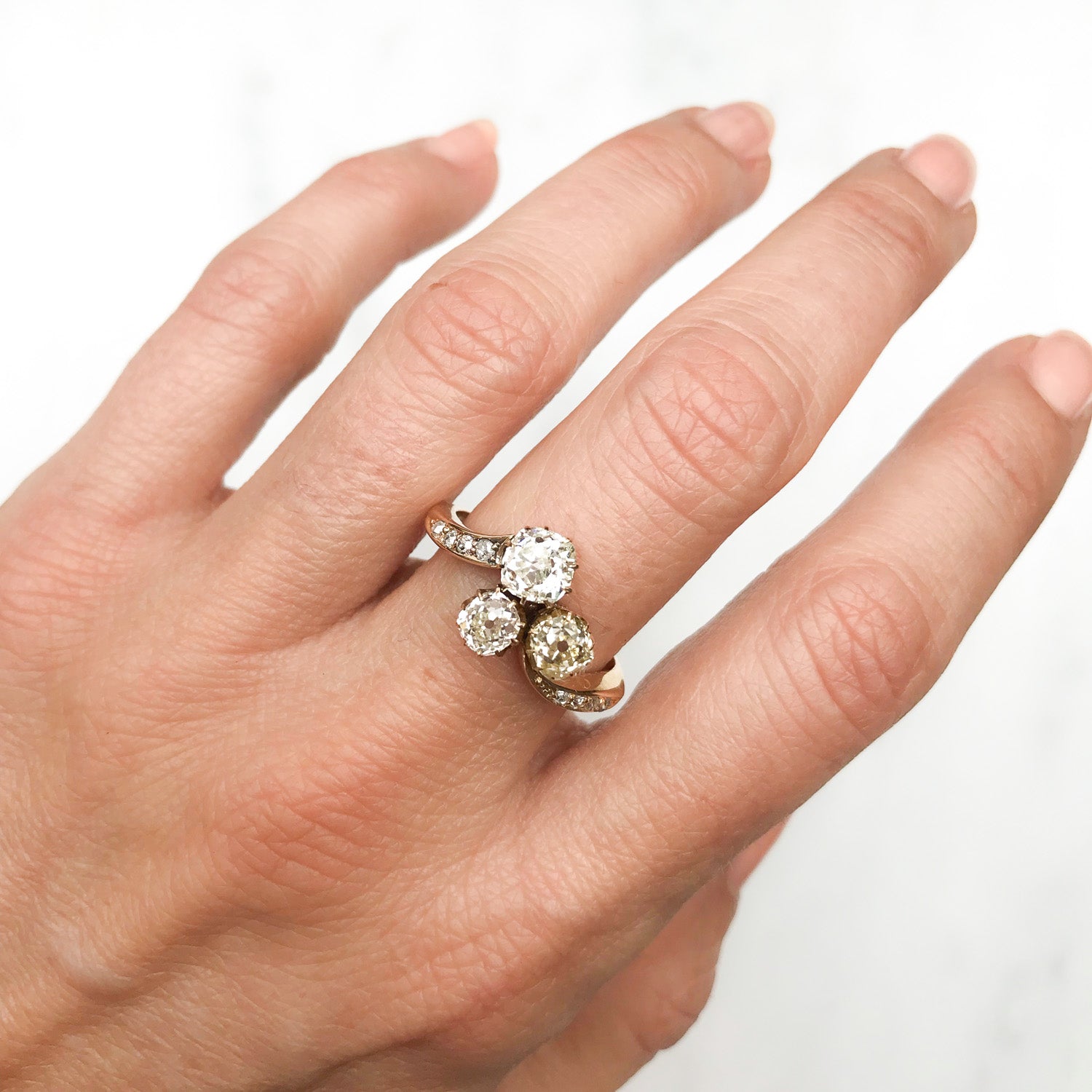 A beautiful treasure from a bygone era, our Clover antique diamond engagement ring is a stunning design dating from the Edwardian era. Hallmarked 1907, the impressive trio of diamonds make a sensational statement, embraced by a diamond-set band that swirls around the finger. The old mine cut diamonds have real character and charm, with two white diamonds weighing 0.80 carats and 0.42 carats paired with an N/O colour diamond with the gentlest of yellow tints. Unlike diamonds today, the trio of old cut diamonds would have been cut by hand to sparkle beneath candlelight, giving them a warm, rustic appearance and beautiful antique charm.