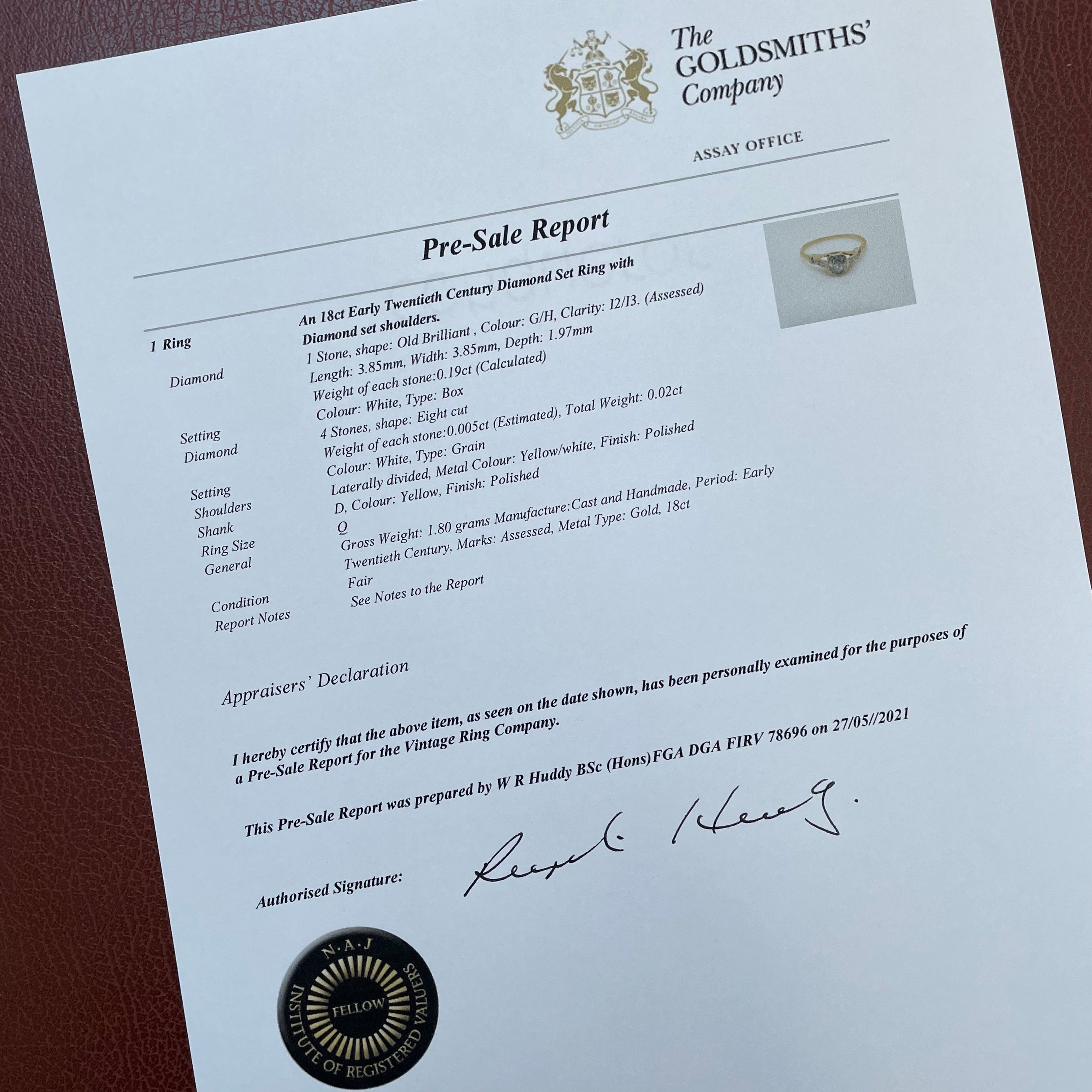 0.19-carat old cut diamond, Colour G/H, Clarity I2/I3, accompanied by four small round diamonds totalling 0.02 carats |